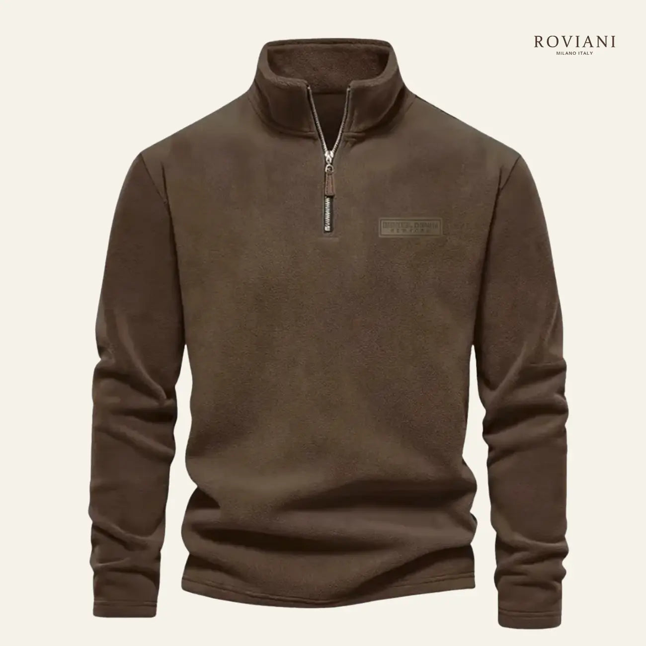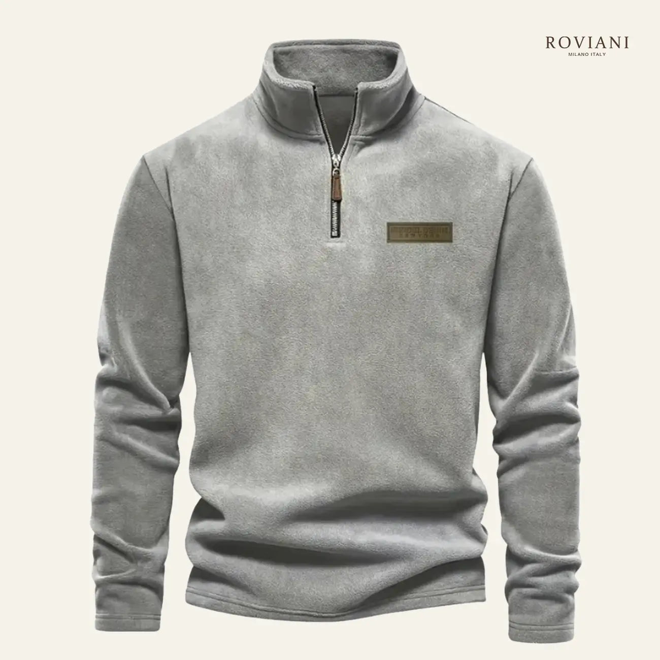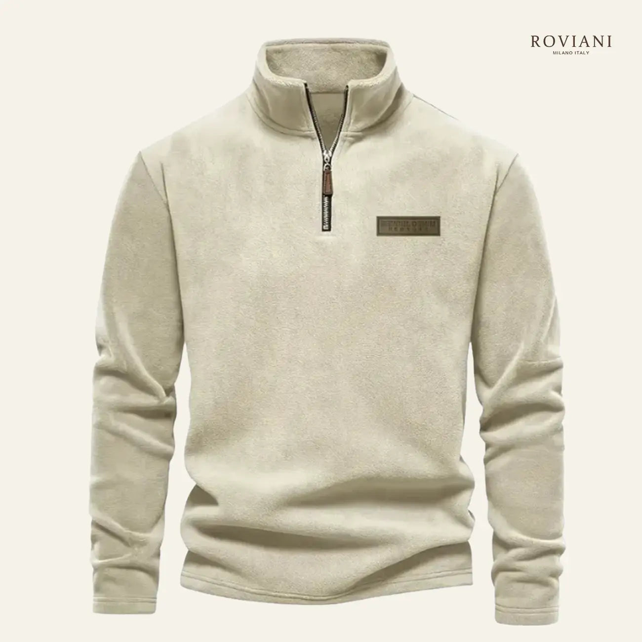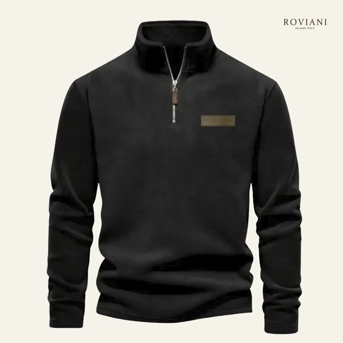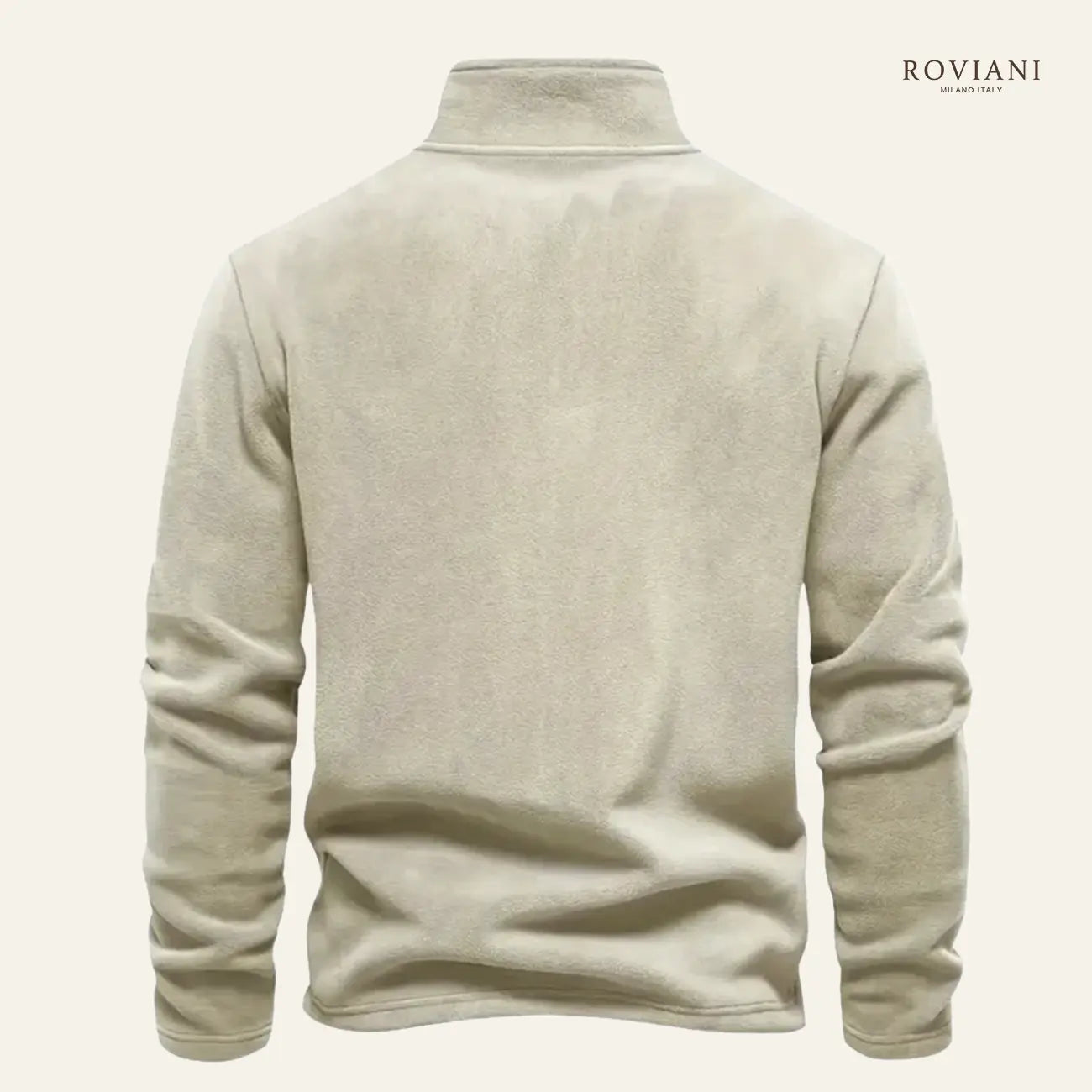 Dettagli di finitura: zip robusta sul collo alto e bordi a costine su polsi e fondo, per un fit comodo e ben definito.